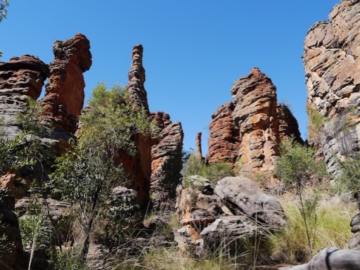 Nouveau suspens dans l'étape suivante, notre carte mentionne plusieurs "lost city" entre Boroolola et Roper Bar : des cités perdues ? S'agit-il de villages abandonnés ? Mais les aborigènes ne construisaient pas de villages. Ancienne civilisation ? Non, plus prosaïque, il s'agit de formations rocheuses qui, à l'image des cheminées aux fées ou pinacles, forment un dédale de tours pouvant donner l'illusion d'une ville abandonnée à la végétation. Excitant ! Nous allons chercher les moyens d'y accéder car certaines ne sont accessibles qu'en hélicoptère et d'autres nécessitent d'avoir obtenu… la clé de la barrière. Le Ranger n'est guère disponible. Alors nous trouverons un site plus accessible. Balade dans une cité perdue photogénique, celle du Sud, proche de Lorella Springs.