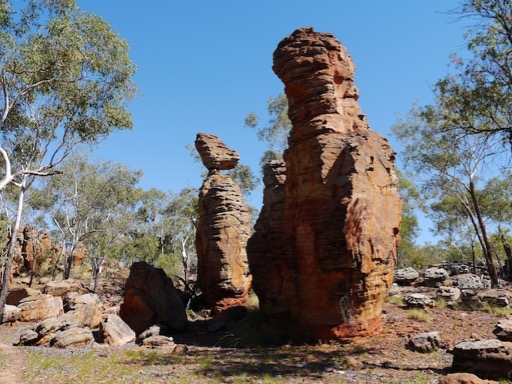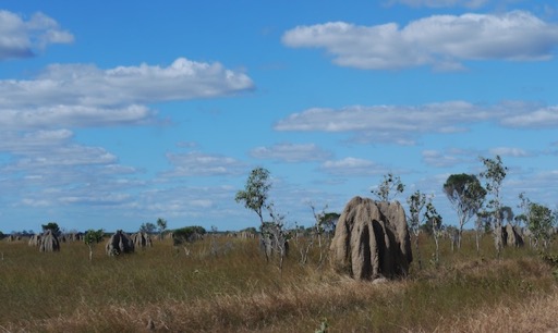 Le "festival des termites", de la famille des cafards et non pas des fourmis qui volontiers viennent les attaquer. Dans l'ouest, nous avions déjà "fait la connaissance" de ces insectes, invisibles, qui construisent leur nid avec leurs excréments. Termitières assorties à la couleur de la terre ambiante, formes arrondies pour les plus habituelles. Il y a aussi "les termites magnétiques". Elles se créent de l'ombre en développant leur nid orienté vers le Nord, astucieux ! La silhouette de leurs termitières est plus fine et plus élancée. Festival…