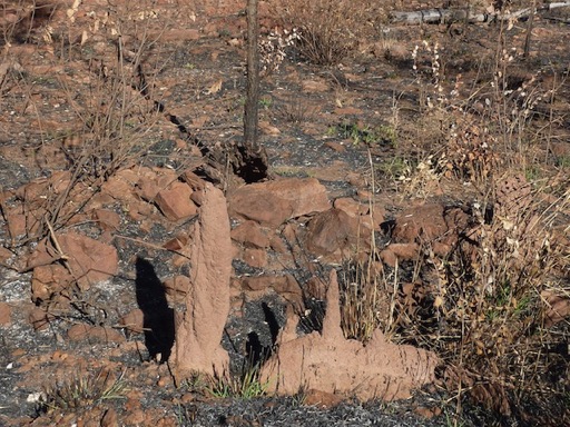 Vie animale, un bel oiseau et les termites qui ne semblent pas affectées par les feux. Si une termitière est tombée sur le côté, la vie "reprend le dessus" et les nouvelles constructions repartent à la verticale. Pas plus compliqué que cela !