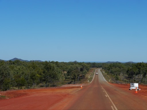 La piste continue vers la frontière entre le Queensland et les Territoires du Nord, 60 km après Hell's Gate. Le relief est plus vallonné avec de nombreux passages de rivières. On imagine la difficulté durant la saison des pluies.