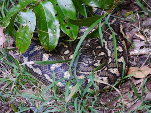 Le python brun digère, se rapproche d'un buisson. Le lendemain, il s'est juste un peu déplacé.
