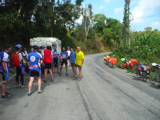 Avez-vous déjà rencontré 10 cyclistes dans la même demie heure ? Sur la route, pas très loin de la frontière chinoise, voici un cycliste solitaire qui arrive devant nous. Attentifs à ces voyageurs combien sportifs, nous nous arrêtons toujours lorsque nous en croisons un. C'est un jovial américain qui nous raconte avoir pensé quelques instants auparavant qu'il ne rencontrerait jamais ici au Laos un "camper" (véhicule récréatif ou camping car) comme chez lui. Eh hop, Pgaz en pleine vue ! Rires, nous bavardons et... trois cyclistes espagnols posent le pied à terre. Ils ne connaissaient pas la présence, devant eux, de l'Américain. Rires, nous bavardons et... six cyclistes au maillot bleu et blanc posent le pied à terre, tout étonnés de la présence des autres ! Rires, nous bavardons, faisons visiter Pgaz car sur les six, quatre sont chinois et deux anglo australiens. Ils pédalent ensemble pour 80 jours. Les Chinois sortent caméras et appareils photos et mitraillent Pgaz. Nous repartons vers le nord et eux tous vers le sud. Quel haut lieu de rendez vous !