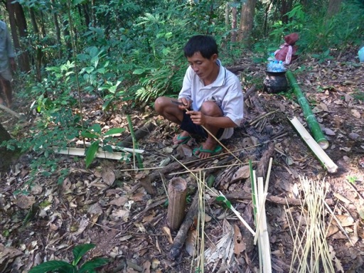 Le bambou, que ferait-on sans le bambou? Des abris, des échelles, des récipients pour chauffer l'eau, des lanières, des tressages, des plats, des cuillères, des pipes, des flûtes, des gobelets, etc. La créativité des peuples des tribus est immense. Daeng grimpe dans les bambous pour sélectionner ses prises et nous verrons le bambou entrer dans la vie quotidienne avec quelques coup des redoutables machettes que chaque homme a autour de sa taille.