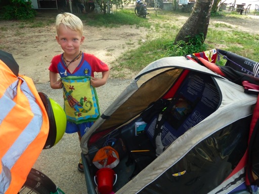 Dernière rencontre en Malaisie, à Cheratin, sur la côte est. Nous explorons à pied le bord de plage pour trouver un bivouac sympathique sans risquer de s'enliser dans le sable mou, comme les "six en route" voici quelques mois. Un jeune garçon s'approche de nous et nous demande, dans un anglais impeccable : d'où venez vous ? Il avait repéré Pgaz et savait bien que nous étions français. Maël a choisi l'anglais. Nous voici en grande conversation, mes parents sont sur la plage, on est arrivés hier soir en vélos, etc. Quelle belle surprise : une famille voyageant, avec ses trois enfants, en vélos depuis un an. Nicolas tire une nacelle avec Timothé, 4 ans, Maêl, 9 ans a son propre vélo, Christelle est en tandem avec Matéo, 7 ans en vélo couché.