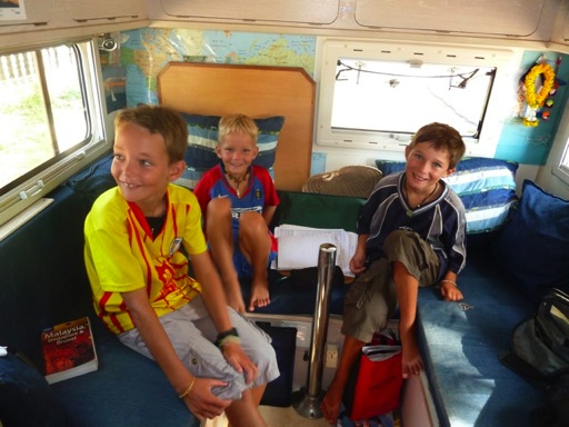Un apéritif en guise de dîner, bien serrés à sept dans Pgaz. Les questions fusent. Il nous restait du pastis, un pâté et du fromage, somptueux repas avec des pommes et des raisins secs. Nous sommes toujours autant touchés de rencontrer de telles familles. Le lendemain matin, il parait que le travail scolaire a été expédié rapidement, les trois garçons voulaient nous revoir. Ils ont exploré Pgaz dans le moindre détail. Ils sont en train d'imaginer leur future cabane dans un arbre.