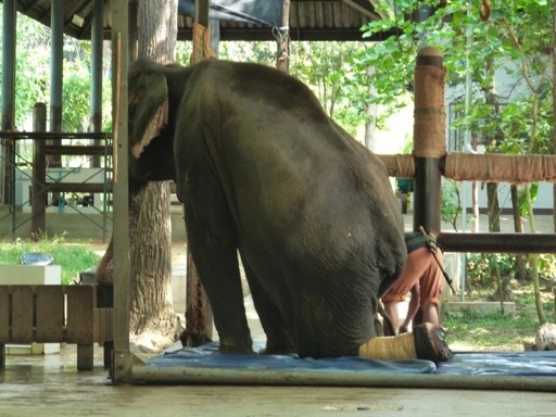 Santé d'abord, le premier hôpital pour éléphants opère depuis 1993 au sud de Chiang Mai. Eléphants renversés sur la route par des camions, bêtes ayant eu la patte arrachée par une explosion de mine ou blessée lors de chutes graves... 3150 cas traités depuis l'ouverture de l'hôpital en 1993. Financé par les amis des éléphants d'Asie, il accueille en ce moment une douzaine de pachydermes. Une femelle, Molata aura eu même une prothèse, ce matin elle ne la porte pas, seul un sac blanc protège son moignon. Un autre clopine sur trois pattes, la quatrième est une plaie ouverte, combien de mois pour une cicatrisation ??? Pour en savoir plus, voir www.elephant-soraida.com