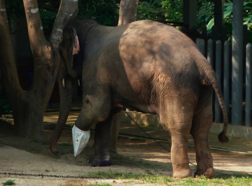 Plus petits que les africains, les éléphants d'Asie ont, entre autres détails cosmétiques, des oreilles pigmentées de rose, une queue à bout plat ornée de poils courbés comme de grands cils. Il resterait 2000 éléphants sauvages dans les forêts de Thaïlande. La fin des travaux de forêt utilisant ces forces de la nature, a fait converger vers des centres de conservation nombre d'éléphants abandonnés par leurs propriétaires. Reconversion touristique pour les uns, reproduction pour les autres et soins palliatifs pour les bêtes gravement blessées. Ayant visité le Centre de reproduction des éléphants au Népal, nous avions envie de voir ce qui se faisait en Thaïlande. Nous aimons tout particulièrement ces gros animaux. Amusant aussi de noter que les animaux, parmi les plus forts et les plus gros, sont végétariens : éléphants, hippopotames, rhinocéros, buffles, chevaux... et que les hippopotames feraient partie des pachydermes, comme les rhinocéros et bien sûr les éléphants.