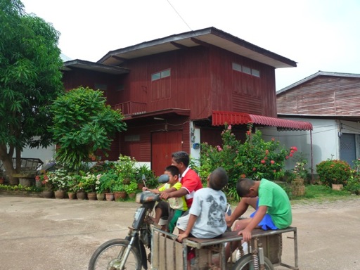 La vie nous semble plus aisée, plus facile. Pas de vélos mais des centaines de motos, pas de piétons mis à part quelques moines marchant le long des routes. Beaucoup de grosses voitures et une dominante de "pick up", la Thaïlande en serait le second pays consommateur après les USA. Des camions roulant au gaz naturel. Des magasins de taille respectable et des centres commerciaux nombreux aux abords des villes. Des bus à étages dernier cri. Un réseau routier excellent. Une conduite automobile rapide mais pas de concerts de klaxons. Les temples se succèdent et surprennent par leur aspect "village". Nous mettrons un peu de temps à en découvrir l'organisation et la finalité car le soir ils peuvent être envahis de petits commerces sous tente ! A quatre heure trente du matin, la méditation chantée des moines déclenche un concert simultané des chiens du quartier durant quelques minutes puis le calme revient et la mélopée religieuse continue. Des écoles nombreuses et bien équipées en terrains de sport. Des enfants en uniforme chantent l'hymne national chaque matin. En maternelle, on monte le drapeau dès 4 ans.