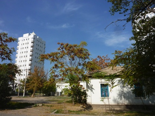 Les femmes sont en robe longue ajustée à la taille, les fillettes portent un uniforme vert, le vert de la robe de Bécassine avec un tablier blanc à volants. Foulards colorés noués sur les cheveux ou calotte brodée sur le crâne voisinent avec les jeans serrés et les tailleurs stricts des russes blondes bien fardées. Toute voiture circulant est potentiellement taxi. Un signe de la main et on espère que quelqu’un s’arrête, c’est 1 manat du kilomètre, le bus est 5 fois moins cher. Une consigne, faire attention à la prise de photos. Je n’ai jamais vu autant de policiers, militaires, gardiens... sans pouvoir compter ceux qui sont en civil. Les talkies walkies crépitent tous les 25 mètres sur les trottoirs. Chaque angle de rue compte ses 4 gardiens. Sur la ligne blanche, ils se tiennent au milieu de la circulation tous les 20 mètres. Avons tellement hâte de quitter le centre ville ! Il reste quelques anciens quartiers qui n’ont pas (encore) été rasés. Ruelles ombragées mais sans éclairage nocturne, goudron défraîchi, plaques d’égout branlantes, petits commerces de proximité : il faut sonner et la guérite s’ouvre pour acheter du pain, une carte téléphonique ou d’autres confiseries. Nous nous sentons mieux dans ces lieux de vie.