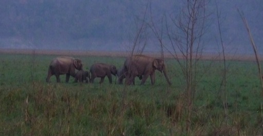 Fin d'après midi, nous optons pour un safari à dos d'éléphant. quatre personnes assises derrière le cornac. Il faut une estrade pour grimper sur le pachyderme. Ce soir la balade nous ramène du côté de la rivière. L'éléphant ne contourne pas les buissons, il va tout droit, descend vers la rive, remonte en face et avance dans la savane tranquillement. Soudain il barrit, se cabre, un tigre surgit des hautes herbes, nous fait face à 15 mètres ! Moment de stupeur, un face à face figé des deux bêtes puis le tigre se retire sous le couvert des buissons. Nous étions aux premières loges, assis du côté où la rencontre eu lieu ! Quel cadeau !