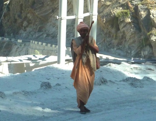 L'Inde touche les himalayas nord, aux pieds desquels s'étendent ensuite des espaces plats quasiment sans autres reliefs significatifs jusqu'à l'extrémité sud du pays : pas de transition entre ces deux mondes géologiques. En remontant vers la Spity Valley depuis Shimla, nous longeons d'abord la rivière Sutlej. Le Wangoo hydraulic project, un gigantesque chantier hydraulique se déroule sur une soixantaine de kilomètres : barrages successifs, retenues d'eau, captations latérales avec des tunnels, consolidation du lit de la rivière, rehaussement de la route, création de nouveaux passages en pleine paroi rocheuse, cimenteries, dragage des sols, ateliers mécaniques, centrale électrique... le travail est continu... la poussière aussi ! Tout est devenu gris ou beige : la route, les baraquements, les quelques arbres rescapés... Les ouvriers et leurs familles habitent sur place, parfois dans des cabanes en tôle mais aussi dans des abris de fortune le long de la route. Inde moderne des "grands chantiers", Inde quotidienne des conditions de vie insalubres. Les engins de chantiers et gros camions charrient des tonnes de béton, de graviers et de roches. Mais les travaux de voirie (élargissement de la route, consolidation des passages étroits...) continuent à mobiliser de la main d'oeuvre sous équipée : on casse les pierres à la masse, on coule le ciment à la cuvette, on nettoie les remblais au balais... adultes, enfants, bébés vivent à longueur de temps dans la poussière et la circulation incessante du chantier. La route passe au milieu du chantier, le sadou aussi !