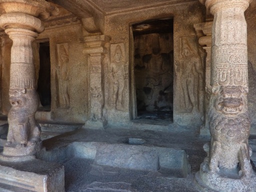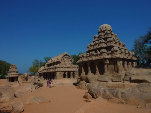 Mallapuram, bord de mer au coeur du Tamil Nadu, au sud de Chennai, les temples ont été creusés dans d'énormes blocs rocheux, des boulders imposants, au VI ème siècle. Le petit temple marin est bien érodé par le temps mais les autres ont mieux résisté.
