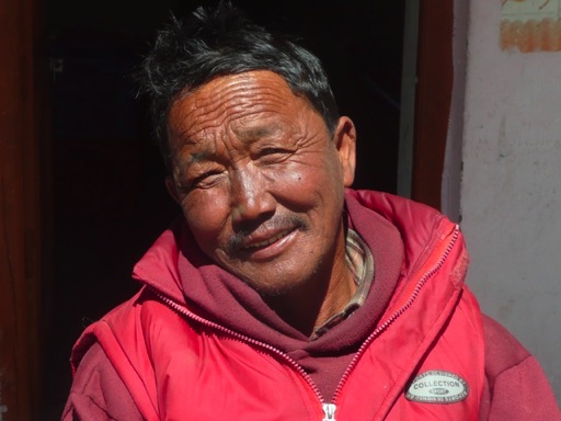 Peu de surface plane ! Le village est accroché à un promontoire, toits en ardoise, maisons basses et temple bouddhiste au centre. Les écolières sont en uniforme bleu et blanc, les nattes relevées. Toc toc toc, le bruit d'un martèlement continu nous fait pousser une porte : deux artisans travaillent des plaques de cuivre et sculptent l'effigie des moulins à prières... petits et grands modèles, on les croise ici dans les moindres villages. Un coup de main et le moulin tourne lançant au vent les prières, comme les drapeaux plantés devant les maisons claquent dans l'air les messages pieux imprimés ou encore les guirlandes de fanions autour des stupas. Version individuelle, le moulin à prière se tient dans la main et on le fait tourner comme une quenouille qui filerait de la laine.