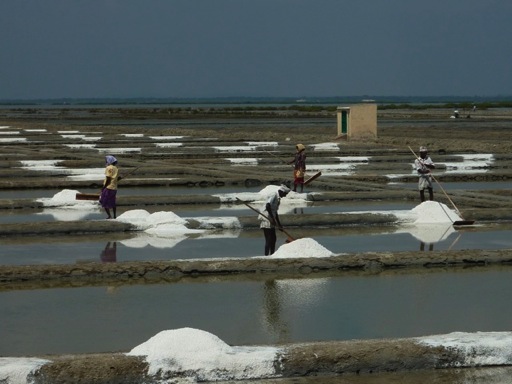La collecte du sel est effectuée pieds nus par des hommes et des femmes certains munis d'un râteau, d'autres récoltent à la main vers une cuvette qui sera vidée dans une hotte.