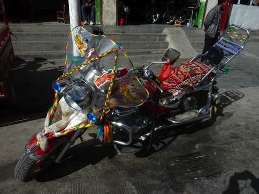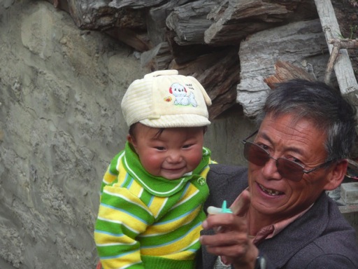 Les maisons traditionnelles ont une réserve de bois sur la terrasse du toit, un portail décoré, des fenêtres d'angle, parfois un motoculteur, plus souvent de gros boeufs aux cornes empanachées de pompons rouges. Les galettes de bouse brune sèchent contre les murs avant d'être empilées en meules couleur chocolat. Pas d'antenne parabolique visible, on va chercher l'eau avec des bidons. Avez vous observé le pantalon du petit sur le dos de sa mère ? Facile pour faire ses besoins !
