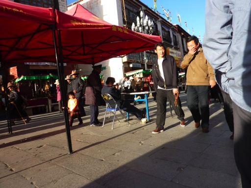 Le vieux Lhassa, un autre monde. Les gens défilent autour du temple Jokhang dans le sens des aiguilles d'une montre. Ils font tourner leur moulin à prière, égrennent leur chapelet, om mane padme om (O le joyau dans la fleur de lotus). Ils avancent d'un bon pas car les attroupements sont tout de suite encerclés. Partout des militaires en faction, pas une rue du vieux Lhassa leur échappe. Déambulant à notre gré, enfin sans guide, nous croisons des soldats marchant en groupe de cinq, sur les toits d'autres surveillent les mouvements derrière leur casque en plexiglass. Tous les cent mètres un parasol abrite la police municipale. S'arrêter trop longtemps dans une échoppe et voici la police qui vient gérer les relations. Parler dans un square à un groupe de jeunes et voici qu'un observateur en civil se met à vous suivre à la trace.