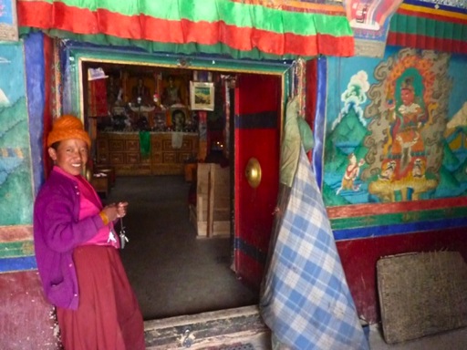 Tout près de l'Everest, Rombuk, le plus haut monastère du Tibet. Comme pour les autres que nous visiterons les jours suivants, en voici les constantes : un site perché souvent sur un promontoire, des maisons où vivent les moines ou des villageois autour des bâtiments du monastère. Parfois une haute clôture de pierre entoure l'ensemble. A l'intérieur : une grande cour, un hall d'assemblée permet de réunir tous les moines, un rangement pour les livres de prière conservés dans leur socle en bois, un autel central avec un ou trois bouddhas (passé, présent, futur), autel devant lequel les fidèles viennent verser de la graisse pour entretenir la flamme des bougies, déposer des offrandes monétaires, demander une bénédiction... un coin de vie où les moines psalmodient, consultent, se reposent, rangent leur fourbi... Les peintures murales (thangka) représentent les figures diaboliques et angéliques des entités vénérées, les animaux du bestiaire religieux (tigre, éléphant, singe, lapin, paon, brebis et boucs...) ainsi que la roue de la vie, le calendrier tibétain, l'histoire de Gautama Bouddha, etc...