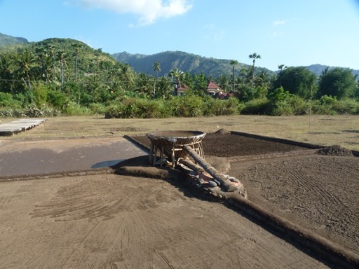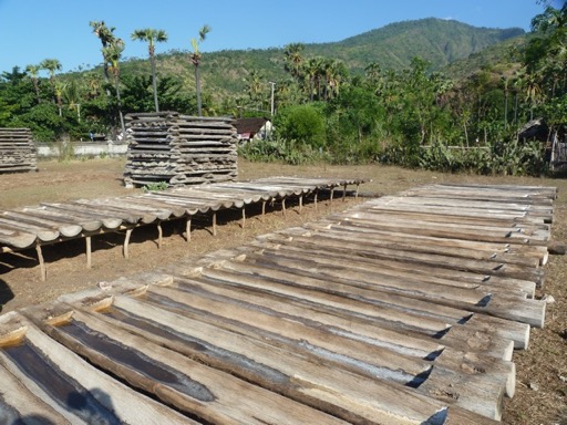 Exploitation de sel en bord de mer à Ahmed, est de Bali. Séchage sur troncs de palmier après le passage dans l'égouttoir central. Le Timor procède autrement.