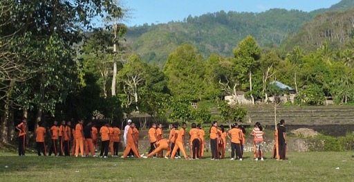 Ecoliers en rouge et blanc, entraînement sportif pour les filles, les adultes travaillent ou se promènent. Les femmes portent pantalons ou jupes tissées, les hommes aussi parfois la tenue traditionnelle : tissages ikat, dont les coloris varient selon les villages.