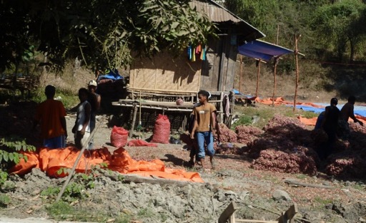 Multiples séchages en bord de route : riz, cacaouètes, piments, algues, poissons, etc. Les femmes déploient les toiles, ratissent, mettent en sac.